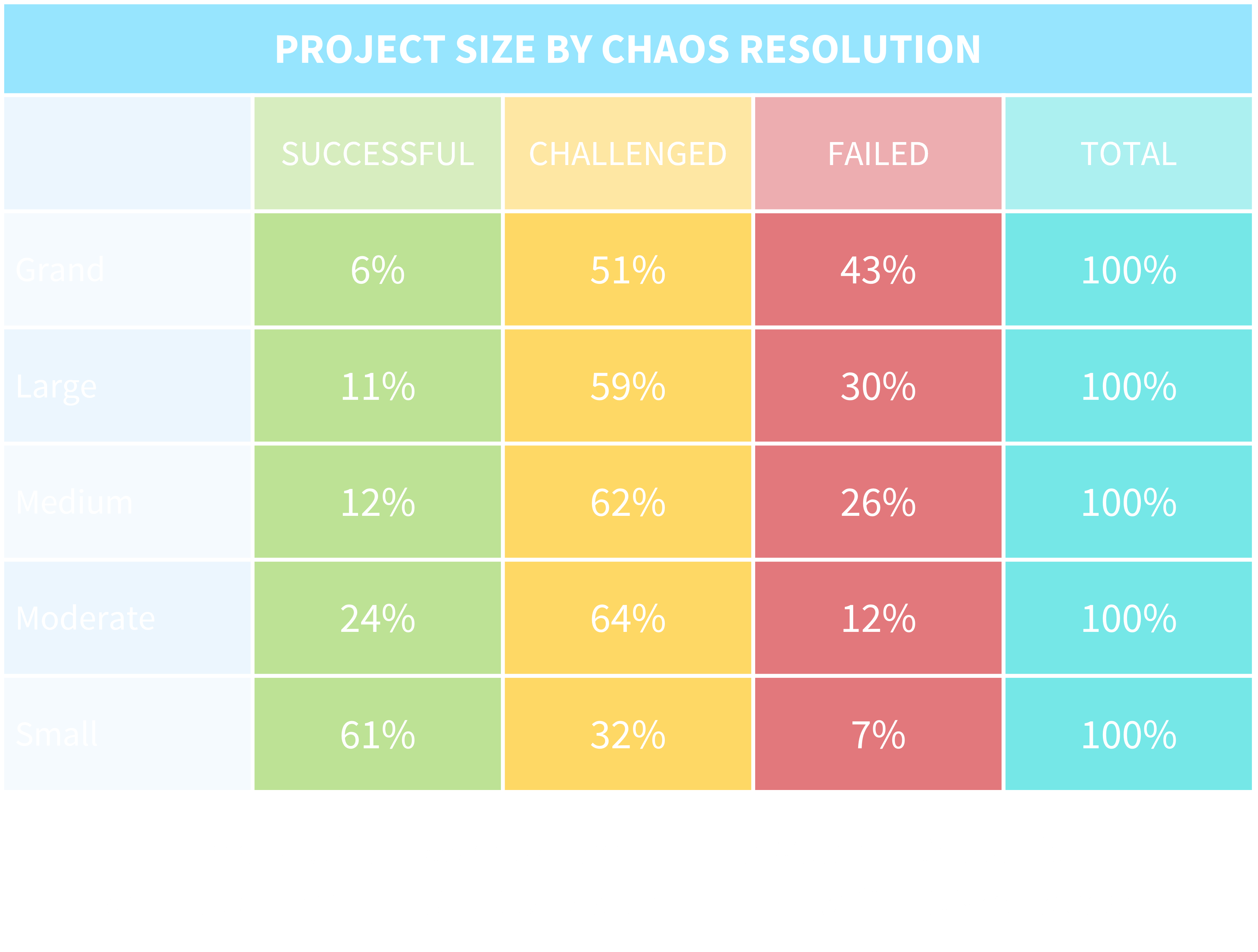 The table below is taken from the Standish Group’s CHAOS Report of 2015 which assesses project outcomes from a broad database of software projects. From the report, “It was clear from the very beginning of the CHAOS research that size was the single most important factor in the resolution of project outcome.” Success in this context is defined as On Time, On Budget, and with satisfactory results: